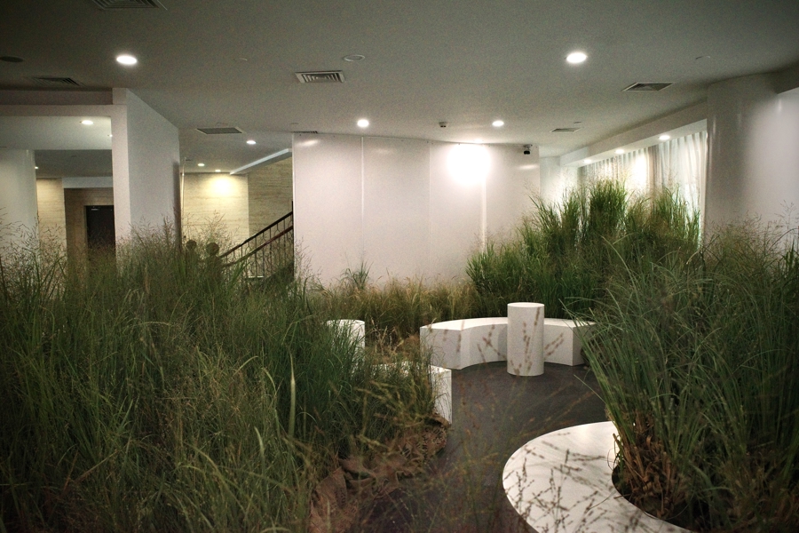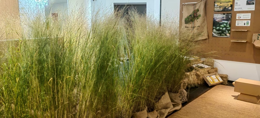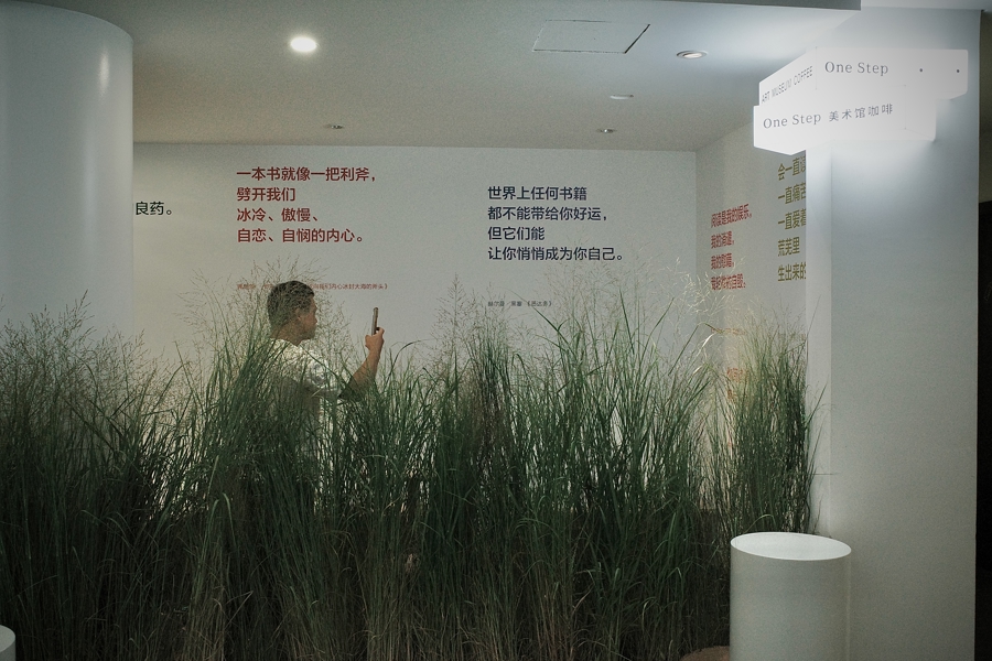 说起“一尺花园”,不少人第一反应就是绿意盎然的场景氛围和自然美学基调,几乎每家店都一座难求。刘海粟美术馆的One Step美术馆咖啡同样保持这种美学风格,近一人高的芒草环抱整个空间,走进去,有一种迷失感。除了中央区域的木质桌椅可供休闲、小憩外,走入芒草中,还能寻到圆形的白色大理石桌椅错落其间,如同交叉小径的花园。记者发现,这些芒草被装在麻织的袋子里,可以灵活移动。整片望去还是绿的,但草尖已经干枯泛黄。