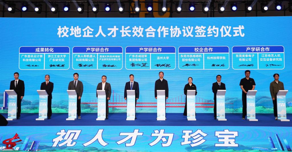4月19日,招聘会现场举行校地企人才长效合作协议签约仪式。新华社记者黄国保摄